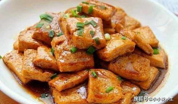 2、锅中油烧热,豆腐用小火煎至微黄,捞出备用。