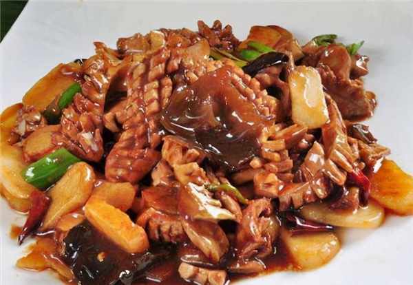 6、将鸡肉片、鸡胗片用开水煮熟,切生,与蒜片、香菜段一起放入锅中,转大火用勺子搅拌,菜汁混合均匀!