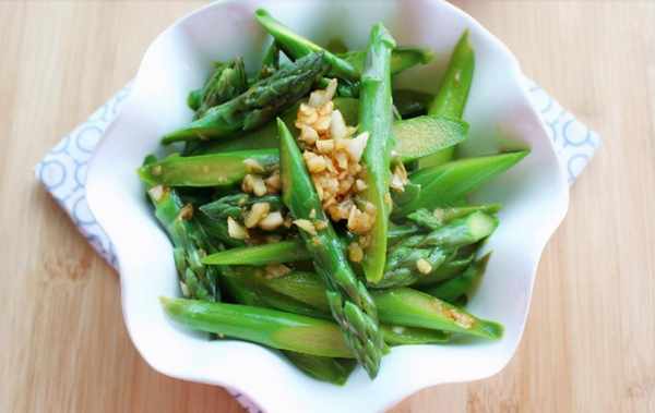 材料:芦笋400克,大蒜4瓣,盐、糖少许