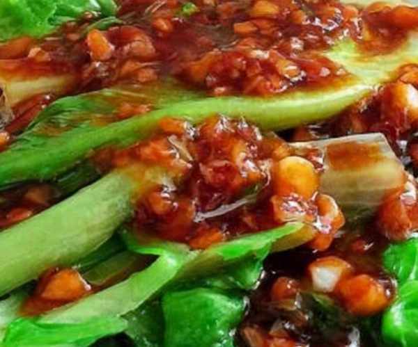 3、油烧热加入切碎的大蒜,炒至入味,加入青菜,翻炒两下,加入淀粉水装盘;