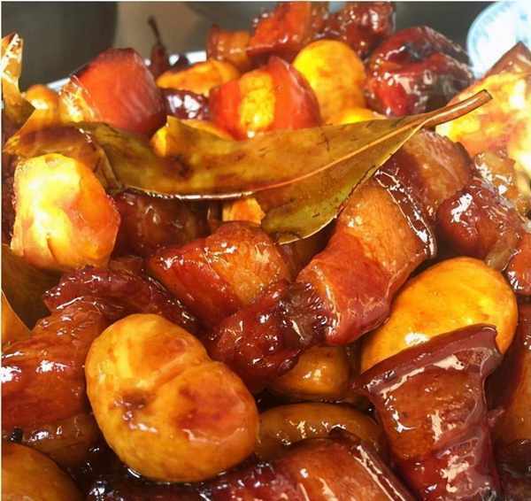 原料:五花肉1斤;1把栗子;1段葱;1片生姜;八角2粒;干辣椒2条;1小块肉桂;1小把冰糖;1汤匙生抽;黄酒半碗;