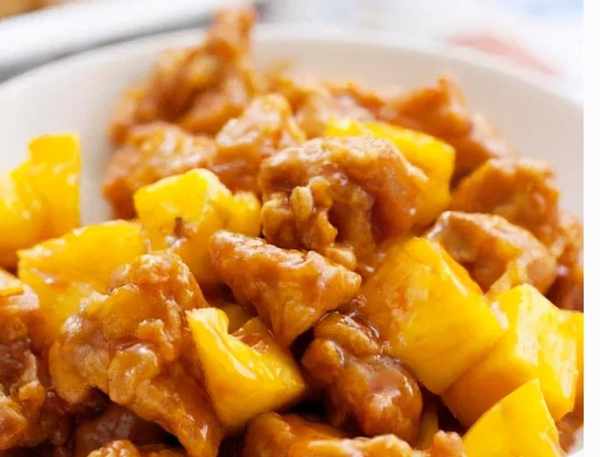 7、在碗汁里煮沸冒泡后,将炸好的鸡块倒入锅中翻炒至碗汁盖住所有鸡块的表面。8.最后将凤梨倒入锅中,炒至顺滑即可出锅