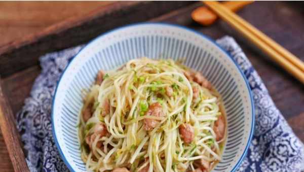 材料:绿豆芽400克,猪里脊肉100克,生抽2汤匙,盐2克,淀粉1勺,料酒1勺,胡椒粉1克,油适量,4克大蒜片