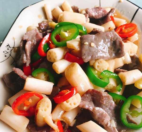3、锅内再放油,放入花椒、藕尖炒至生,加入牛肉炒匀,加盐调味下锅。