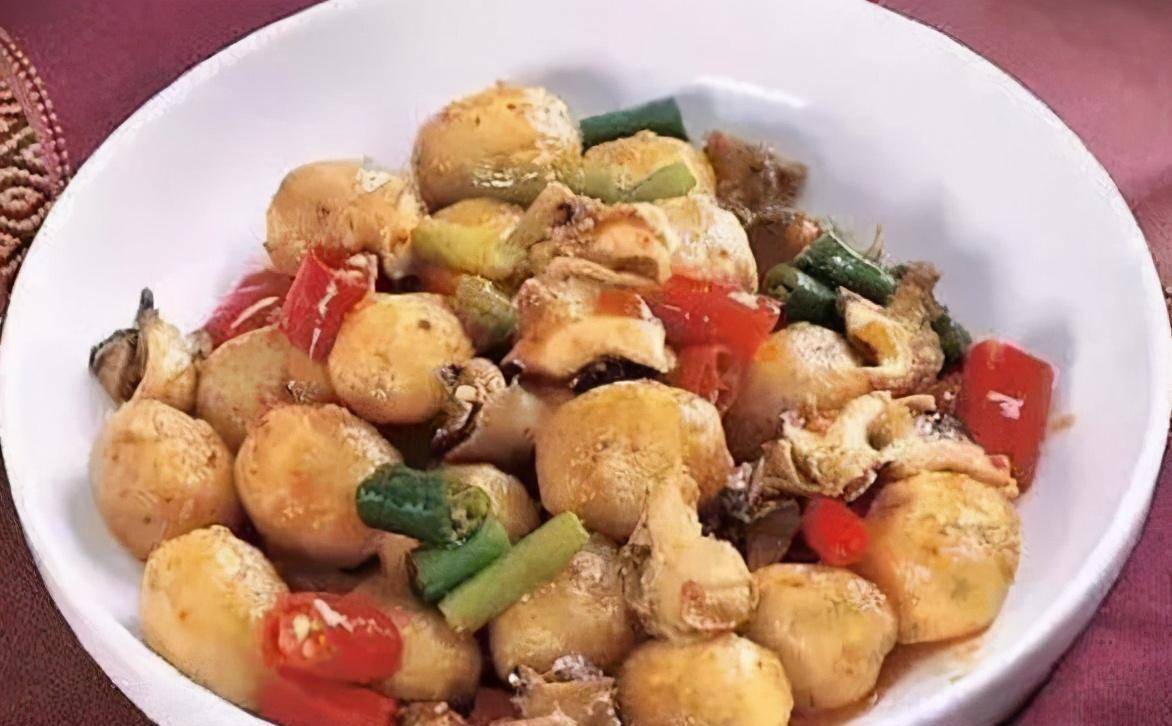 3放入处理好的蛤蜊和小土豆,小火慢炖入味,加入青红花椒粒,水淀粉,大火收汁,淋少许西洋菜油。