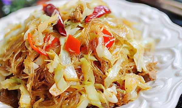 4、待水变软后,下粉丝翻炒,加入盐,让粉丝充分吸收炒出的水分;