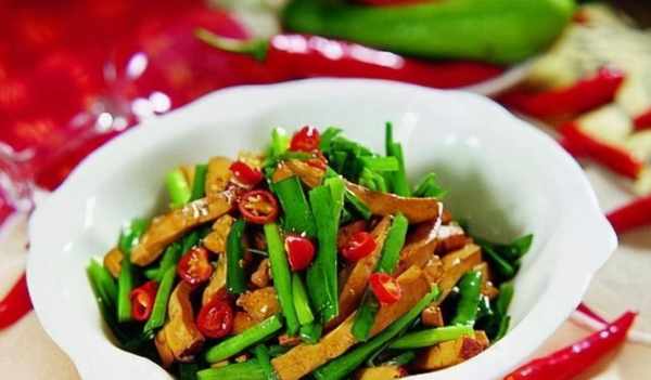 材料:韭菜、香干红辣椒、油适量、盐少许、生抽适量