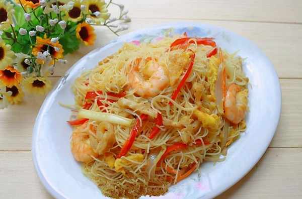 材料:米粉、虾仁、鸡蛋、食油、蚝油、生抽、鸡精、红辣椒