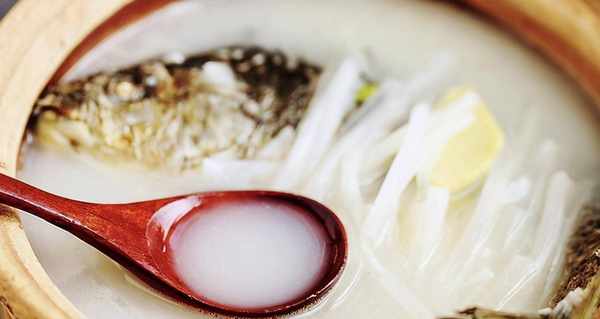 6、大火煮5分钟后,鱼汤会变成浓稠的乳白色。水煮奶白鲫鱼汤:先将鲫鱼下油炸至鱼皮呈褐色,然后入沸水中煮熟。