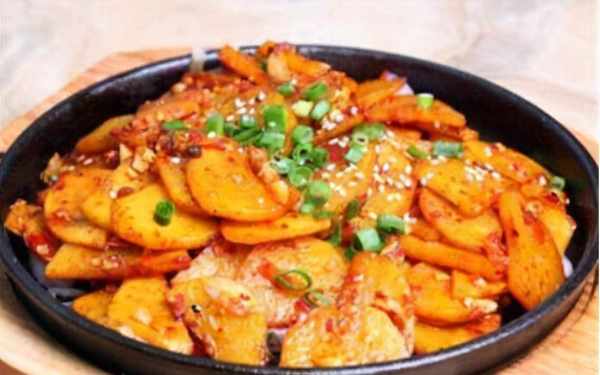 6、再放入焯好的土豆片,加入老抽、生抽、鸡粉、味精和盐,大火翻炒一分钟。