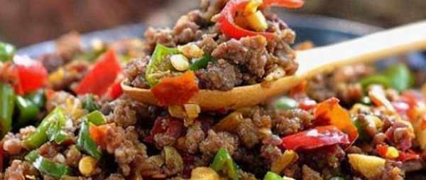3、倒入肉末快速翻炒,加入1汤匙料酒和生抽。炒至水几乎完全干燥,加入切碎的灯笼椒。淋上少许香油,加少许鸡精即成。