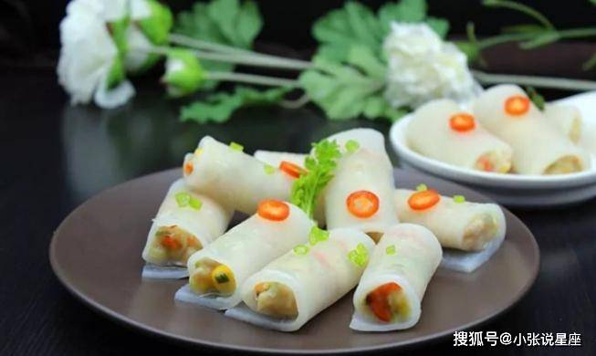 2、将晶莹剔透的萝卜片放入准备好的馅料中,卷起来;
