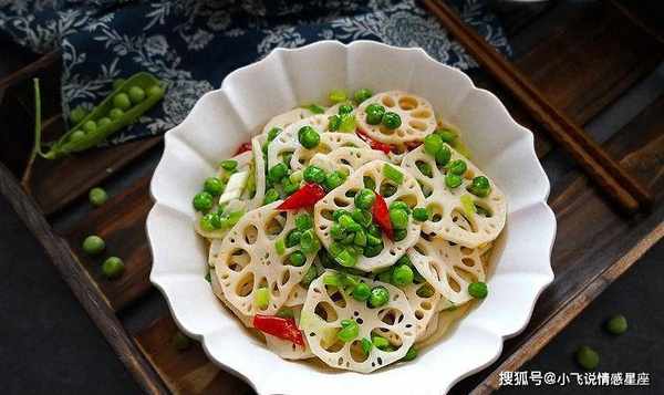 4、锅干后,加入食用油加热至70%,放入莲藕用高温炒1分钟,然后加入豌豆继续炒2分钟。