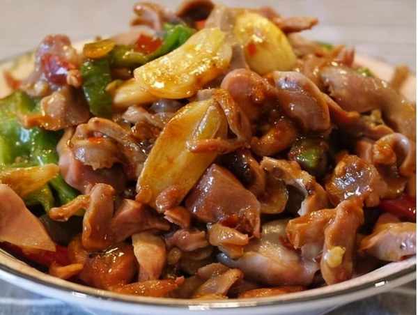 4、加入腌好的鸡内脏,用大火煮至生;加入青椒翻炒,加入少许老抽,炒至青椒生熟,加盐调味,淋上少许香油。