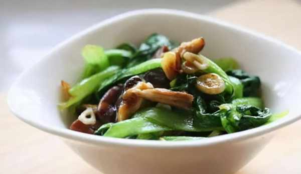 3、加入油菜、香菇和适量蚝油翻炒两分钟;