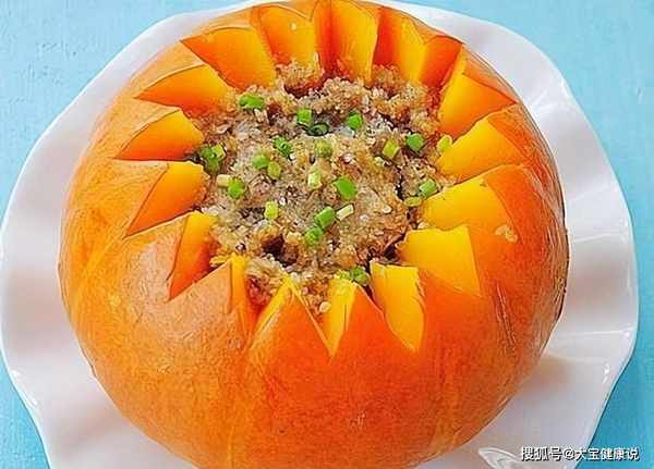 原料:腊南瓜500克,猪肉碎50克,小米贻贝、葱花、盐、白胡椒粉、老抽、味精、色拉油适量。