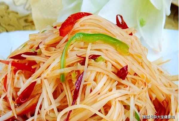 1、土豆去皮,切成细面条,放入冷水中溶解淀粉,浸泡片刻,捞出沥干水分待用。