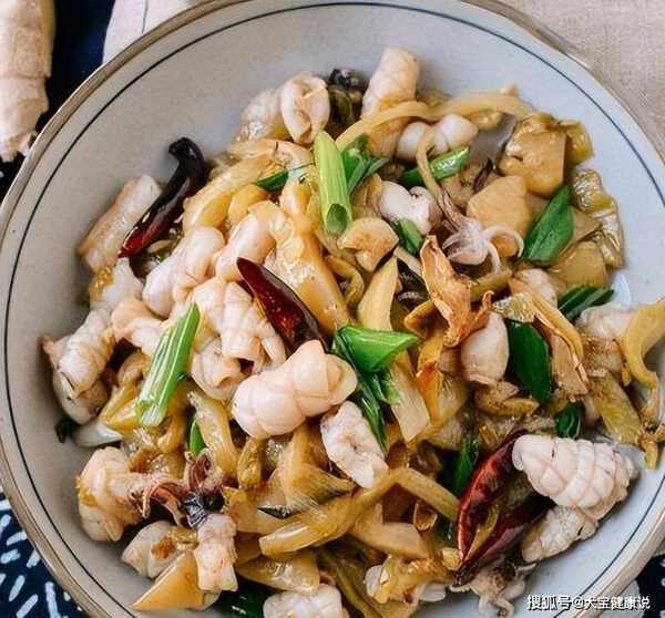 材料:鱿鱼、酸菜、青椒、芹菜、泡椒、姜、蒜、盐、糖、酱油、料酒、米醋