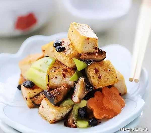 1、北豆腐切成2厘米见方的块,胡萝卜去皮切块,辣椒去蒂去籽切成三角块,香菇洗净切小块。2.锅里倒入橄榄油,大火烧至70%热,放入豆腐块,改中小火炸至几面金黄,捞出。