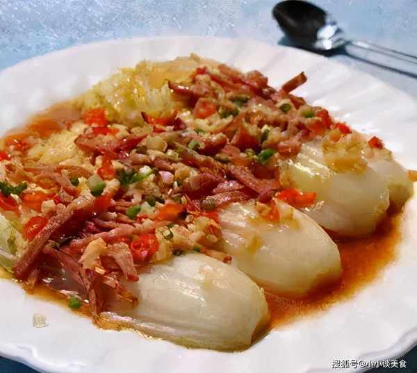原料:火腿、蒜末、娃娃菜、姜葱蒜、油盐、酱油。