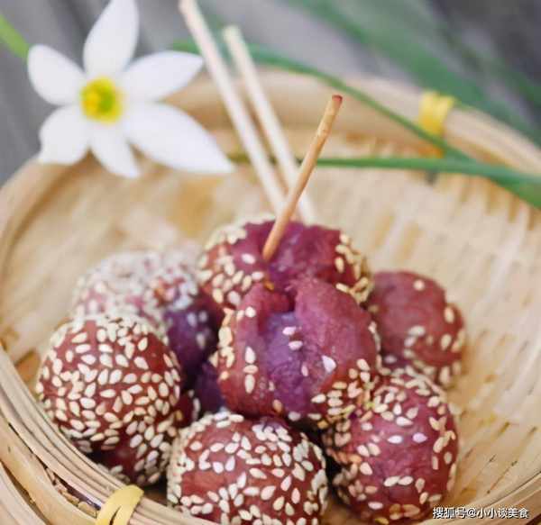 做法:紫薯去皮切小块,微波炉加热或直接上锅隔水蒸熟,压成泥,加少许牛奶拌匀,放入容器中,慢慢加入很多糯米粉和糖揉成均匀的面团