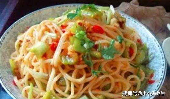 3.将芽菜、水煮花生碎、小葱末、红辣椒末和蒜末倒入面条中,拌匀即可食用。