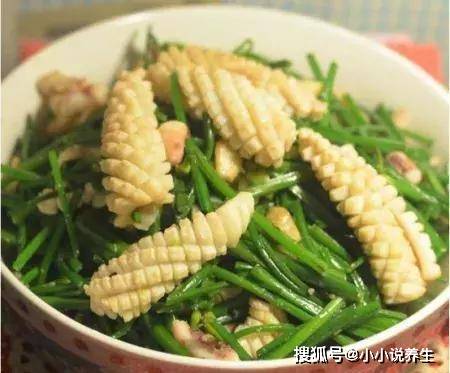 实践:1、鱿鱼洗净后,去掉鱿鱼胃里的东西,撕掉鱿鱼的皮,从头上切下眼睛。鱿鱼花X切面。然后切成三角形。用酱油料酒腌制备用。将韭菜花洗净,切块。