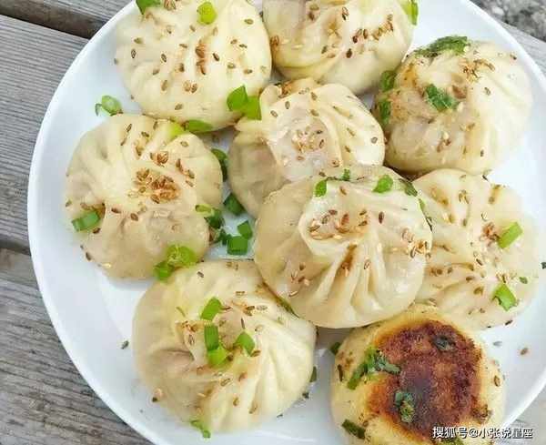 3、揉面脱气后,将发酵好的面团分成8等份。取一部分面团擀成中间厚面,两边薄面,包上馅料。