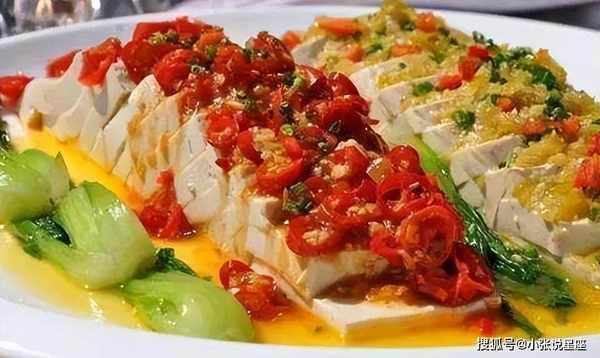 2、根据豆腐倒入剁好的辣椒,淋上蒸好的鱼豉油,将豆腐盘用保鲜膜包好。不要漏气。
