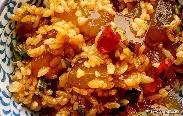 4.加入米饭翻炒至米饭和果冻和谐共存。一定要把凉粉炒到米饭上色均匀,然后装盘。