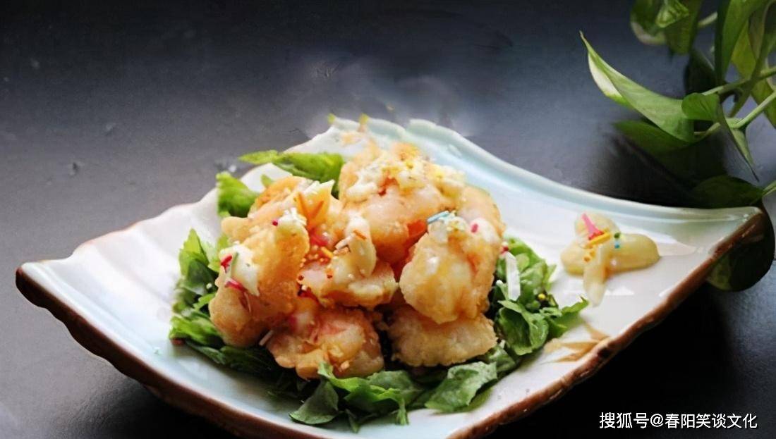 8.将圆形沙拉放在盘底,上面放上炸好的大虾,挤上沙拉酱。