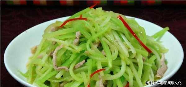 1、沙拉切成均匀的条状,瘦肉切成同样大小的条状。锅内放少许油,将肉丝煎熟。肉丝煮熟后,将其从锅中取出。