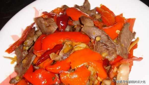 5、锅内放油,烧热,放入辣椒、蒜片翻炒片刻,倒入猪心,加入辣椒粉、盐、味精