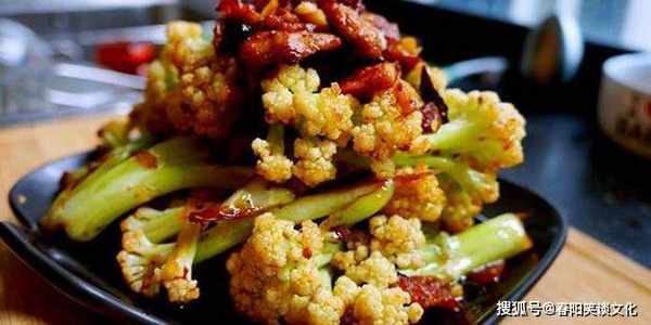 热锅放油,下肉片炒香,下蒜片,干辣椒炒香,下花菜,花菜下锅,锅盖上油,盖上锅盖,开火不时翻动一下,待花菜变软变甜时加入酱油,搅拌均匀。