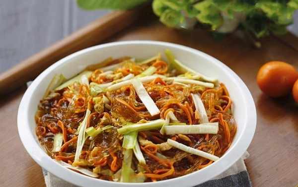 1.干海丝用温水浸泡,洗净,过冷水焯一下