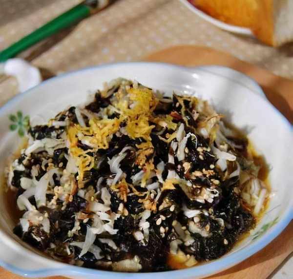 原料:紫菜、白菜心、煮熟的芝麻、姜、蒜。