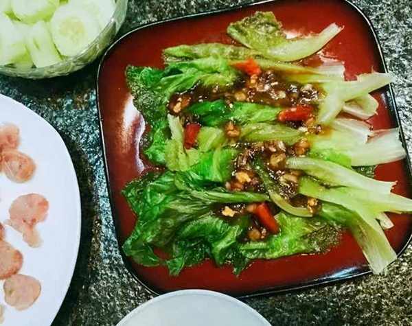 做法1.大蒜切碎,红辣椒切圆,沙拉洗净晾干撕成大块。