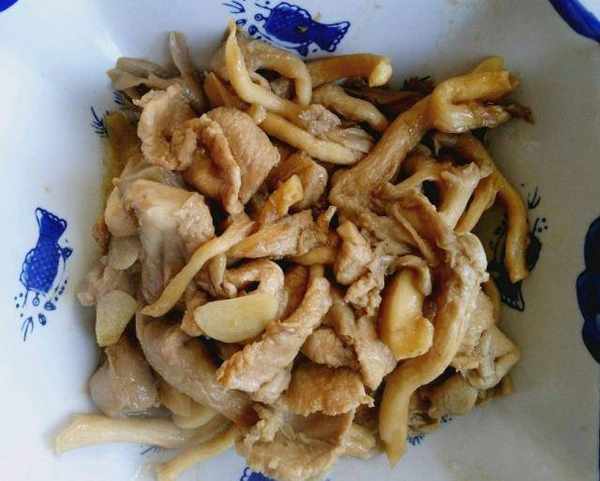 3、锅烧热,倒入适量的油。油热后加入肉丝翻炒。炒至肉丝变色。加入葱、姜和大蒜。老抽上色,然后倒入香菇搅拌均匀,沿锅边倒入少许料酒,加少许水,煮1分钟,然后开始调味,盐适量,糖少许,搅拌好,最后加入蚝油和胡椒粉,搅拌均匀即可食用。