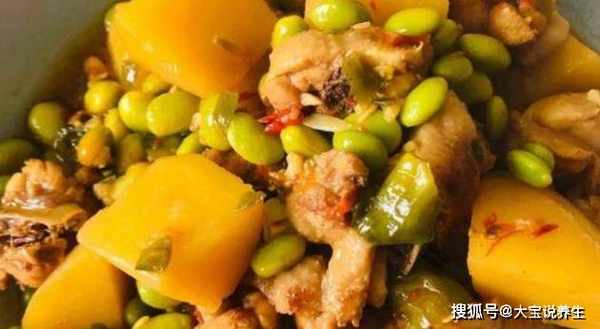材料:鸡翅根、土豆、毛豆、辣椒酱、青椒、盐、酱油、热水