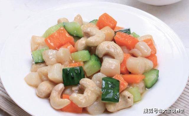 材料:扇贝肉200克,水煮腰果30克,水煮胡萝卜切片黄瓜丁20克,姜片5克,料酒5克,盐3克,淀粉适量