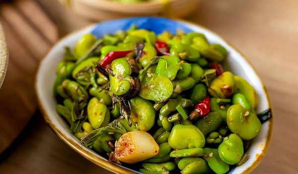 汆熟的蚕豆上方薄薄地铺上一层椿芽,热葱油一浇,刺啦一声——