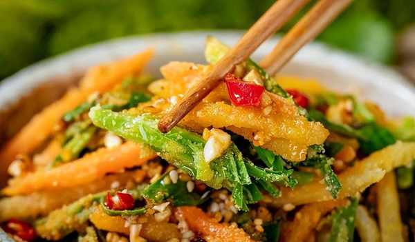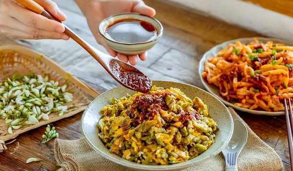 槐花裹上了蛋液,外层柔美内里娇脆,施以一勺油泼辣子,便能吃出肉荤的气质。