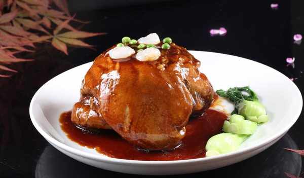 八宝鸭是沪菜中的一道名菜,主料有鸭、糯米,辅料有火腿、冬笋、豌豆、虾仁、栗子、干贝、鸡肫、香菇、鸡肉等。八宝鸭成品香味浓郁,形态时尚,色彩鲜艳,饱满多汁。