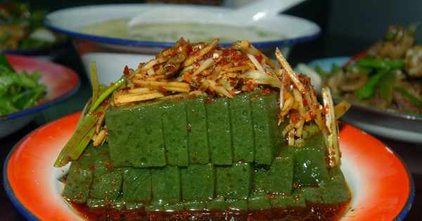 神仙豆腐佐以葱花、姜丝、蒜泥、花椒粉、香油、香醋、酱油、精盐,调制出来的凉拌神仙豆腐晶莹碧绿、气味清香、温软润滑、香辣可口,好吃到你想哭。