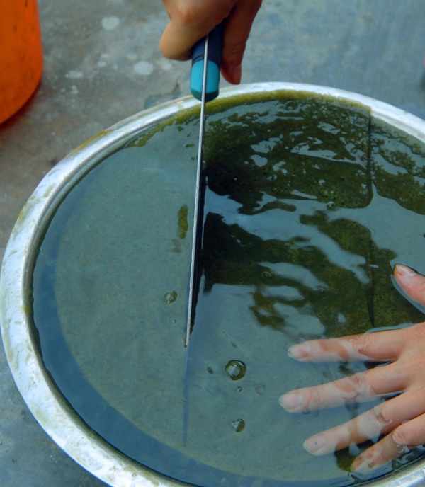 神仙豆腐的具体制作流程:清晨(叶子最新鲜),到山上采集神仙树叶,回家后选弃残叶、病叶、树梗,清洗原料树叶并凉干明水,洗净用于盛装神仙豆腐的盆子,盆子中放树叶后兑沸水,用树杈按顺时针方向旋转搅拌,搅拌至糊状原浆,用纱布过滤,收拢纱布挤出汁液,成碧绿原汁果胶,在残渣面上点卤并过滤卤汁,拌匀果胶原汁和卤汁,冷却凝固两小时,划块切割,然后清泉漂水三次,换水去卤三次,成品神仙豆腐即制作成功。