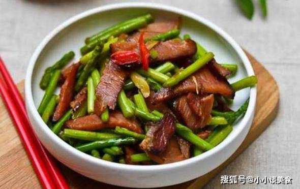 3、热锅下油烧热,加入辣椒、蒜炒香,加入腌制好的瘦肉翻炒,瘦肉炒香后倒入芦笋翻炒;