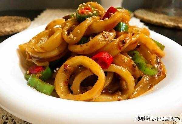 实践1.冷却好的鱿鱼筒内外洗净,撕掉表面的红皮和里面的黑膜,切成环状,用开水煮十多秒出水,捞出、淋浴,用冷水浸泡几分钟,沥干备用;