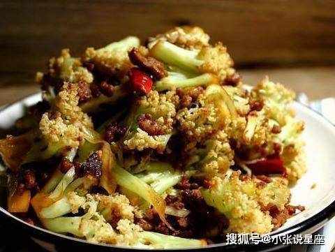 材料:肉末两片,中小花菜一个,蒜茸少许,葱少许,干红辣椒两三个(不能有),辣椒粉少许,辣椒粉少许、料酒、酱油、糖、胡椒粉、醋;