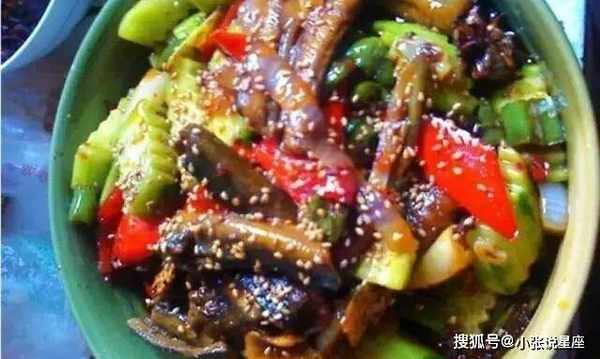 4、剩下的油加入葱姜片炒香。加入洋葱、青椒、花椒、冰糖、干辣椒、干花椒和三分之一的热锅底。出香味后加入鳗鱼和甜椒,加入料酒、蚝油、少许盐和五香粉调味。最后加入黄瓜,一边不停地翻炒一边炒。我觉得脆脆的黄瓜更好吃。