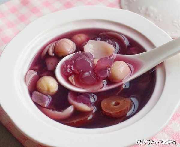 4、将皂角米和百合连同泡发的水一起倒入锅中,使糖水更粘稠,水少时可加适量的水。我用电饭煲。5.倒入莲子和紫薯,按蒸键。如果是普通的锅,大概需要煮半个小时。